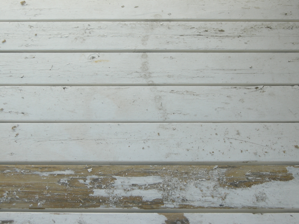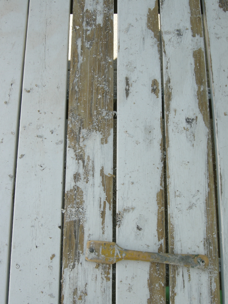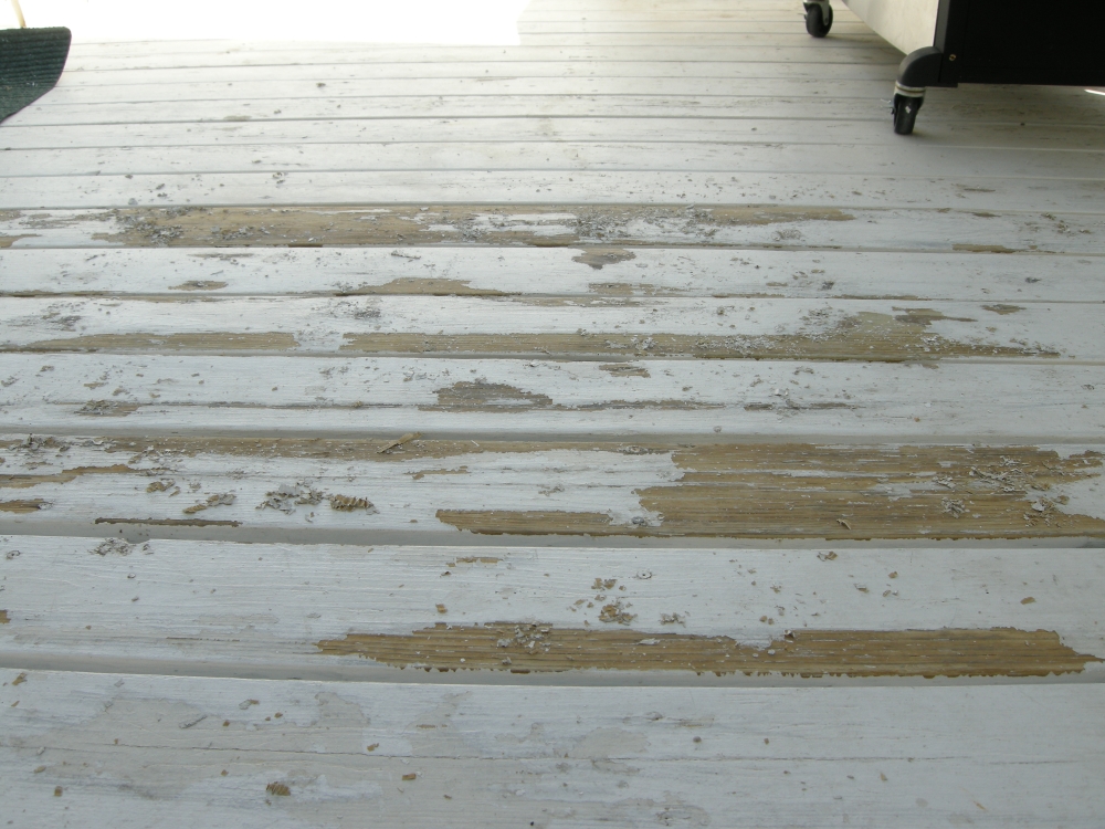 A deck in poor condition which has been partially scraped in preparation for staining. If you're not going to remove all loose material, expect your deck to fail again imminently. |