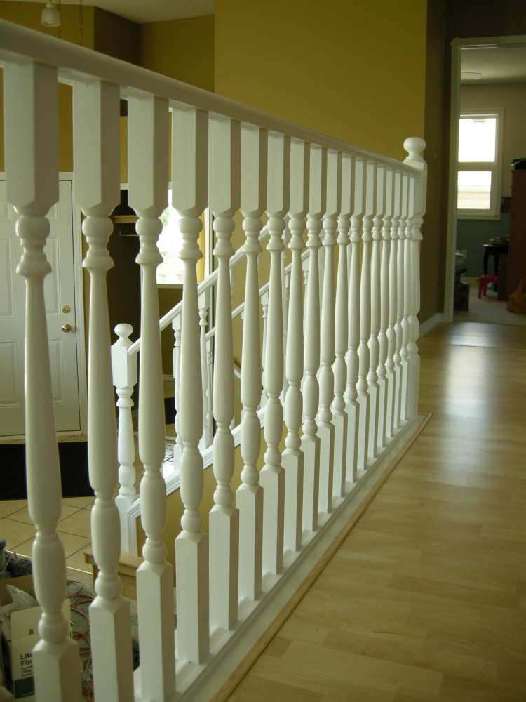 | A railing which was chipped and generally worn. It was sanded, repaired, spot primed and sprayed with acrylic semi-gloss paint. |