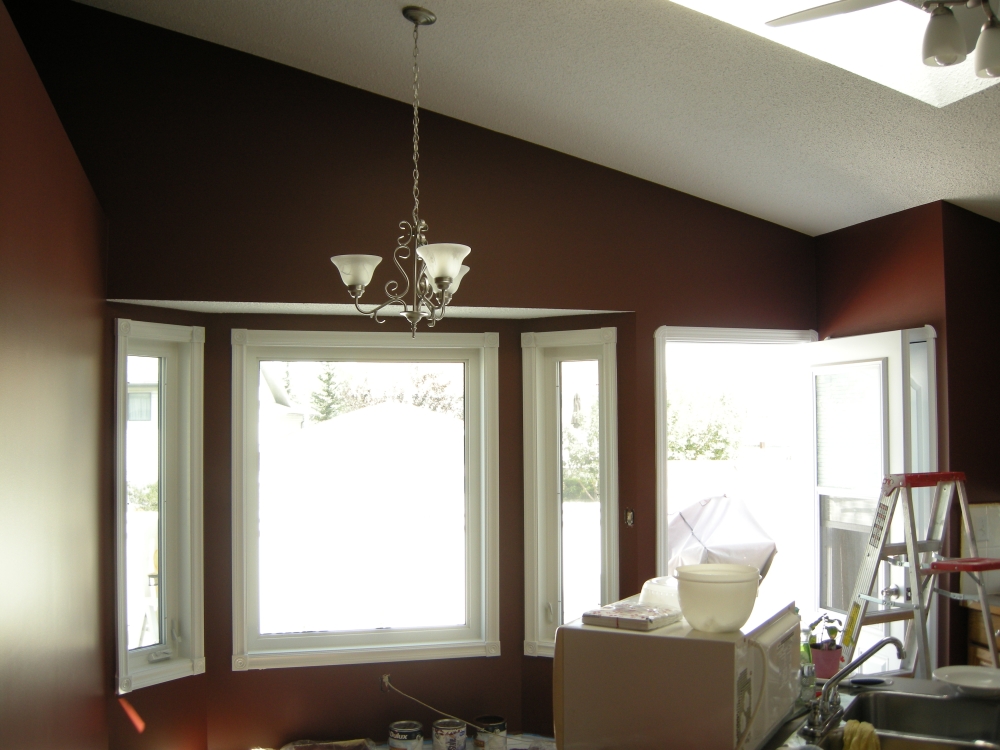 | Walls repaired and painted using a zero-VOC eggshell paint. A slightly yellowed stipple ceiling in the red room (kitchen) was also sprayed with flat white paint. |